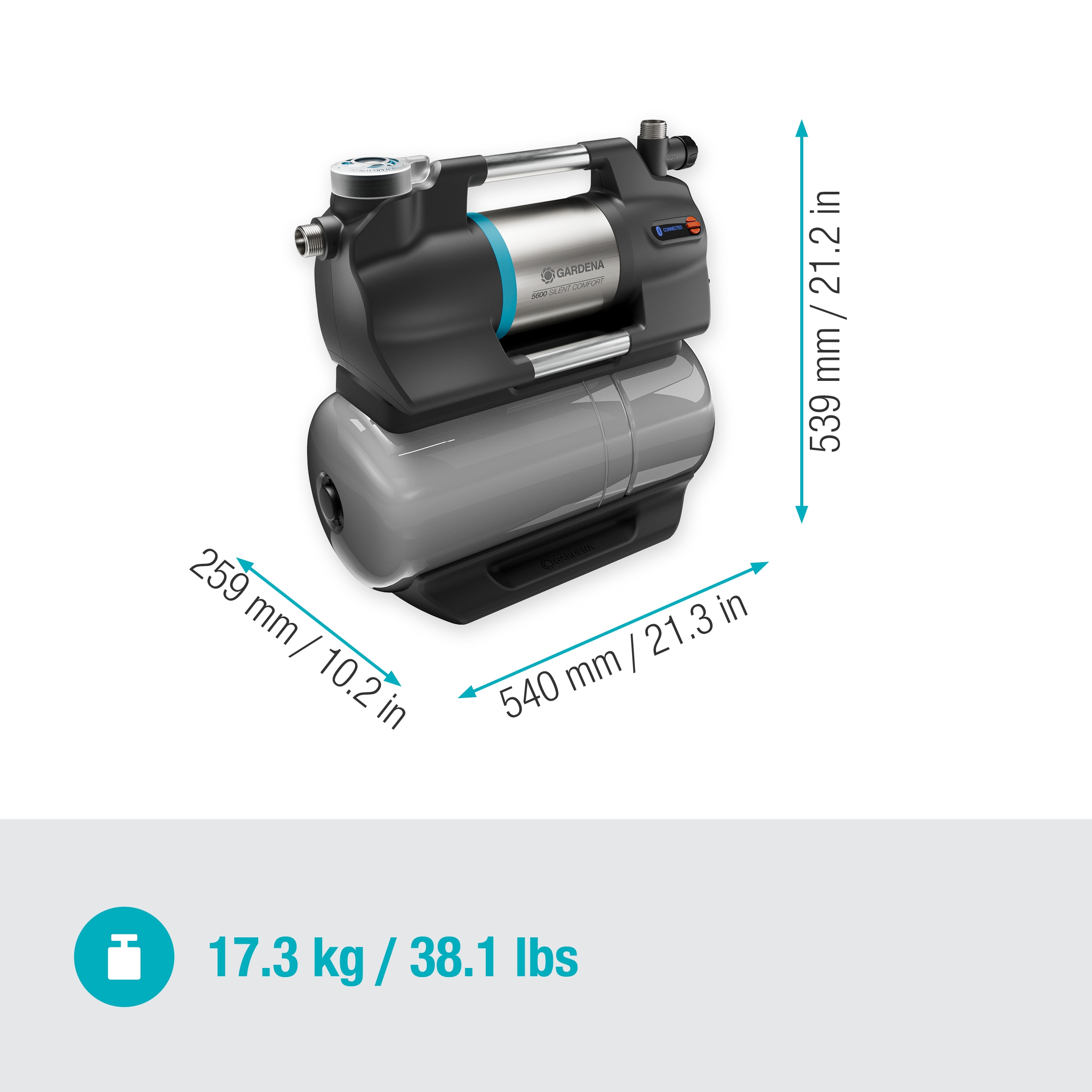 Iepazīstinām ar neticami zema trokšņa līmeņa sūkņiem ar Bluetooth laistīšanas vadību, nodrošinot lielāku jaudu. GARDENA spiediena tvertnes sūknis 5600 SilentComfort sniedz ideālu risinājumu automatizētai ūdens piegādei mājās un dārzā. Spiediena sūknis ir ārkārtīgi jaudīgs ar padeves augstumu 47 m (4,7 bāri) un plūsmas ātrumu 5600 litri stundā. Šī komplekta augsto efektivitāti apliecina nelielais enerģijas patēriņš tikai 900 vati. Tas var pacelt ūdeni no pat 8 metru dziļuma. Izmantojiet sūkni, lai automātiski sūktu ūdeni no lietus mucas, akas vai cisternas uz māju un dārzu, piemēram, tualetes skalošanai vai ūdens padevei veļas mašīnai. Spiediena tvertnes sūknis automātiski ieslēdzas atkarībā no ūdens pieprasījuma un pēc tam atkal izslēdzas. Tā kā ir 25 litru ūdens tvertne, tas darbojas ārkārtīgi klusi un ekonomiski. Vācijā izstrādātā SilentComfort spiediena tvertnes iekārta ir īpaši klusa ar skaņas spiedienu tikai 42 dB(A) 5 m attālumā. Šis zemais trokšņa līmenis ir iespējams, pateicoties inovatīvajai daudzpakāpju tehnoloģijai ar ūdens dzesēšanu. Šai tehnoloģijai nav nepieciešams ventilators, jo dzesēšana notiek caur ūdeni, nodrošinot maksimālu efektivitāti un minimālu troksni. Izņemot laistīšanas grafika izveidi, var iestatīt noderīgas funkcijas, izmantojot ierīces apgaismoto LCD ekrānu, kā arī sākt vai apturēt to. Kā praktisku alternatīvu manuālai darbībai var vadīt sūkni, izmantojot Bluetooth, izmantojot viedtālruni, un vadīt to attālināti līdz pat 10 metru attālumā, izmantojot GARDENA Bluetooth lietotni. Pateicoties GARDENA augsnes mitruma sensora pieslēgšanas opcijai, tiek garantēta ideāla ūdens padeve jūsu augiem iepriekš ieprogrammēto grafiku laikā un tiek novērsta ūdens izšķērdēšana, jo laistīšanas grafiki tiks izlaisti, ja augsne jau ir pārāk mitra. Sūkņa 25 litru ūdens tvertnes iekšpusē ir augstas veiktspējas membrāna, kas nozīmē, ka tvertnei nebūs nepieciešama apkope vismaz piecus gadus. Nav gaiss jāuzpilda, un nav membrāna tvertnē jānomaina. Tvertnes iekšējā membrāna ir izgatavota no ūdensizturīgas, daudzslāņu oderes, kas aizsargā korpusu no korozijas. Integrētais savienojums starp sūkni un tvertni ir izgatavots no nerūsējošā tērauda. Tas padara to ne tikai īpaši izturīgu, bet arī labi aizsargātu, un to var uzstādīt kompaktās vietās. Keramikas blīvējuma sistēma ar dubultu blīvējumu, sausas darbības un pārkaršanas aizsardzība (ūdens un dzinēja), kā arī pēc izvēles aktivizējama ūdens pilēšanas noteikšana un integrētais smalkais filtrs nodrošina ilgu kalpošanas laiku. Filtrs novērš netīrumu daļiņu iekļūšanu enerģijas taupošajā sūknī vai tā piederumos. Pēc pieprasījuma sūknis atgādina par filtra iztīrīšanu, un lietotne palīdz sākotnējo palaišanu, izmantojot skaidrus, soli pa solim norādījumus, kas pieejami 28 valodās. Gan lietotne, gan korpusa displejs parāda spiedienu. Iebūvēts pretvārsts nozīmē, ka spiediena tvertnes sūknis 5600 SilentComfort ir gatavs lietošanai, tiklīdz to izņem no kastes. Ja vēlaties izmantot elektrisko sūkni, piemēram, dārza laistīšanai, var izvēlēties izmantot Power Boost funkciju. Kad tā ir aktivizēta, tā automātiski nosaka palielinātu ūdens pieprasījumu un deaktivizē paredzēto tvertnes slēgšanas spiedienu. Tādā veidā tiek izmantots maksimālais sūkņa iekārtas spiediens. Tipiskā sadzīves sūkņu problēma, kas saistīta ar spiediena svārstībām laistīšanas laikā, būs pagātne, un būs sasniegta jau ierastā augstas kvalitātes dārza sūkņa veiktspēja. Pēc laistīšanas sūknis automātiski pārslēdzas atpakaļ uz enerģijas taupošo tvertnes darbību. Izturīgais sūknis ir izgatavots no augstas kvalitātes materiāliem, piemēram, nerūsējošā tērauda piedziņas vārpstas un savienojumiem, kā arī motoram un sūkņa korpusam. Vienu no divām izejām var pagriezt par 180°. Pateicoties lielajai uzpildes atverei un atsevišķam drenāžas aizbāznim, mājas sūkni var īpaši viegli uzpildīt vai iztukšot, lai nodrošinātu aizsardzību pret salu. GARDENA piedāvā piecu gadu garantiju spiediena sūknim 5600 SilentComfort, kad reģistrējaties tiešsaistē. Sajūtiet GARDENA sūkņu spēku. Vairāk nekā 40 gadu pieredze.