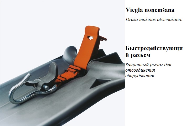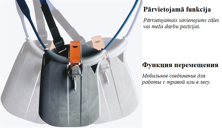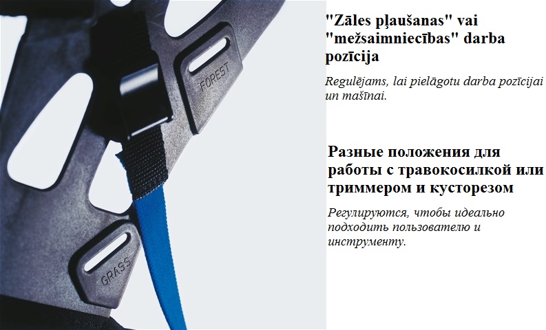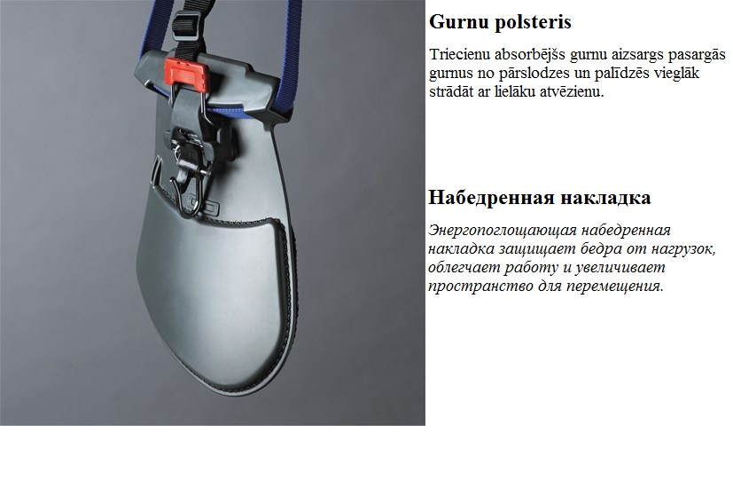 Подвеска «Balance X» (Баланс Икс) эффективно распределяет нагрузку при работе с инструментом по большей поверхности тела, что позволяет снизить утомляемость и вес инструмента. Подвеска оснащена широкой воздухопроницаемой пластиной, которая располагается на спине, и широкими плечевыми накладками. Это помогает снизить напряжение и равномерно распределить вес между левым и правым плечами, а также между бедрами и плечами. Ударопоглощающая накладка снижает чувствительность к соприкосновениям с инструментом во время работы, она регулируется в зависимости от того, работаете вы с триммерной головкой, диском кустореза или выполняете перемещение на другое место. Подвеска очень легко регулируется под пользователя любой комплекции для наибольшего комфорта. Быстрооотстегивающиеся крепления позволяют легко и быстро отсоединить инструмент в случае необходимости или опасности.